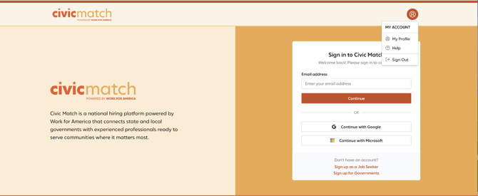 This article walks you through how to log in to Civic Match. This is where you’ll search for and express interest in jobs, track your applications, review employer invitations, and more.